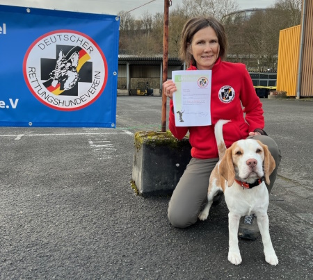 Jake (Just in Time Jimoh von und zu Volkmann) hat mit seiner Hundeführerin Sabine von Arnim am 11.2.2024 den Wesens- und Eignungstest des Deutschen Rettungshundevereins e.V. (DRV) bestanden. Damit kann Jake nun die Ausbildung als Rettungshund der Westerwälder Rettungshundestaffel machen. Wir gratulieren dem Team Jake-Sabine ganz herzlich zu diesem tollen Erfolg!
